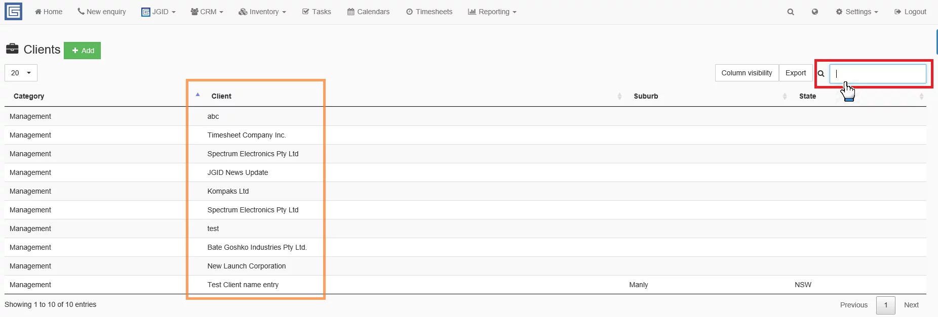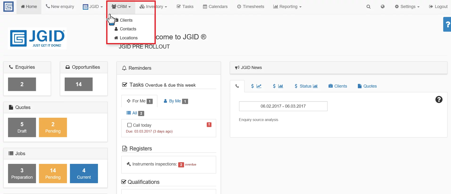To edit a Client entry first click on the CRM button onto the JGID taskbar and then select Clients from the drop-down menu.