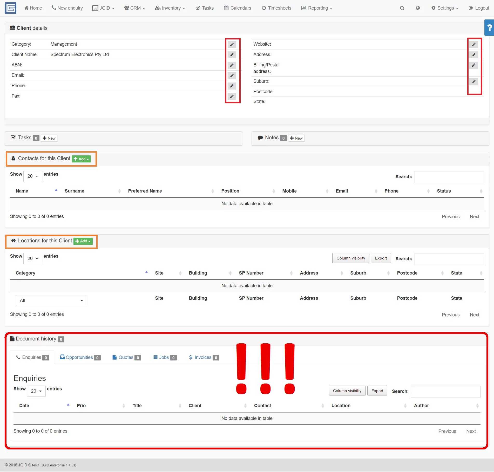 4. Pay special attention to the Document history section, which is only accessible through the Clients category into the CRM. In this section you will conveniently get access to a brief numerical summary of all documents issued in regards to your business with this particular client. To review each document in details, simply click on one of the tabs for either the Enquiries or the Opportunities, the Quotes, the Jobs or the Invoices.